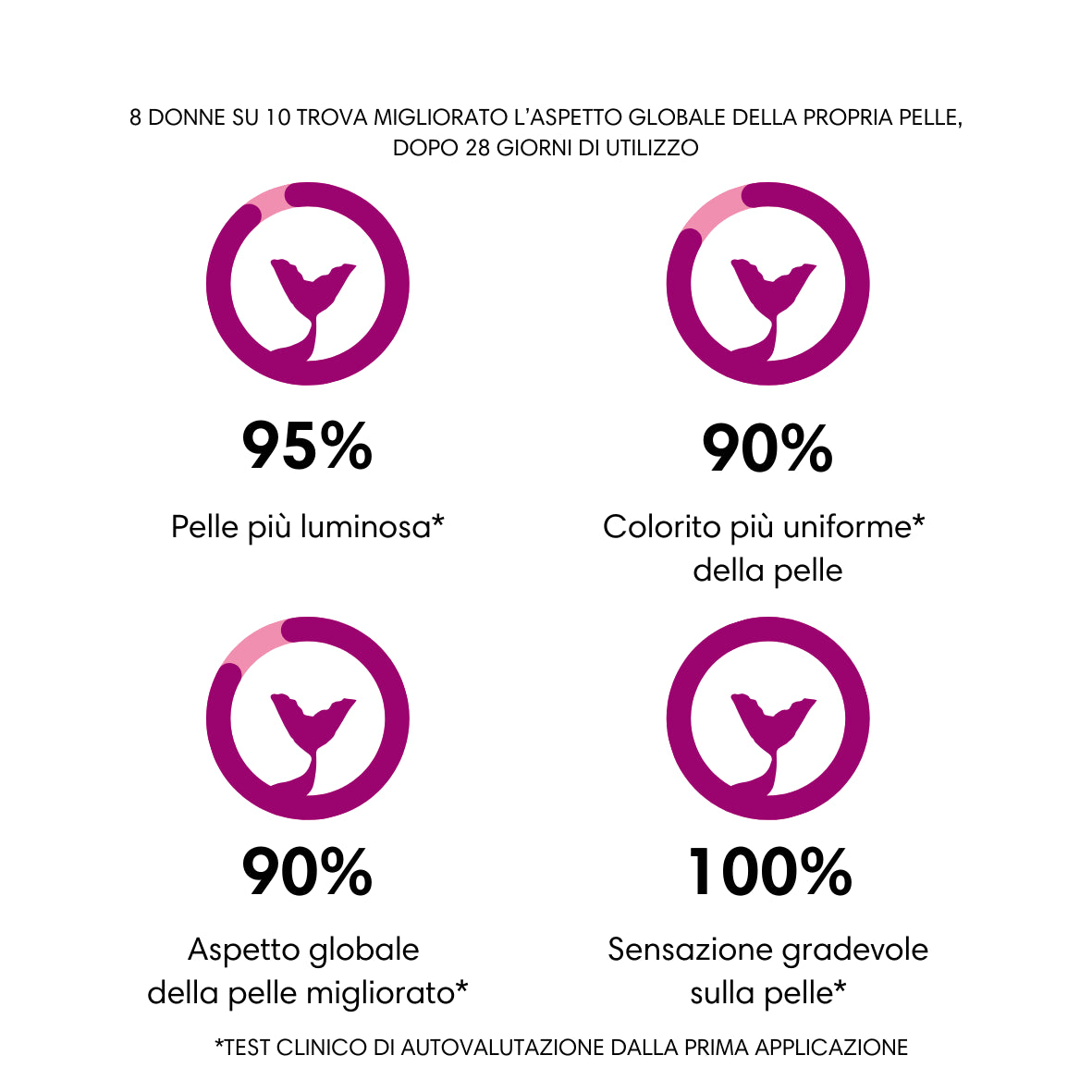 La differenza si nota già dopo la prima applicazione. Lascia la pelle nutrita, illuminata e rosea dall'aspetto sano.