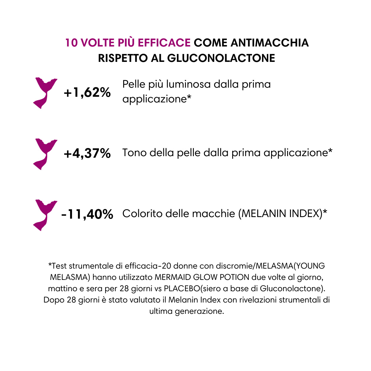 *Test strumentale di efficacia-20 donne con discromie/MELASMA(YOUNG MELASMA) hanno utilizzato MERMAID GLOW POTION due volte al giorno, mattino e sera per 28 giorni vs PLACEBO(siero a base di Gluconolactone). Dopo 28 giorni è stato valutato il Melanin Index con rivelazioni strumentali di ultima generazione.